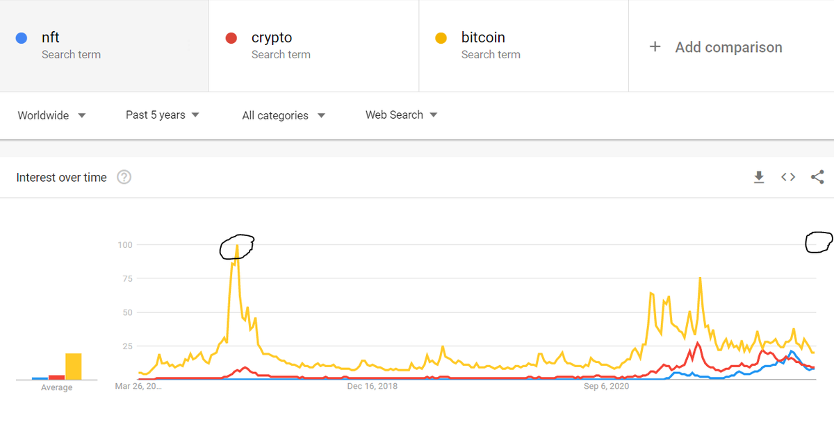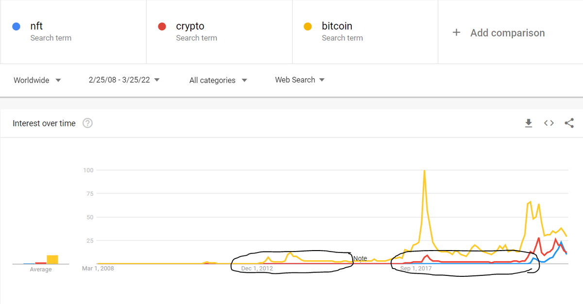 This was the highest 'NFT' interest had ever surged relative to the other two terms, so I became very wary of a pending pop