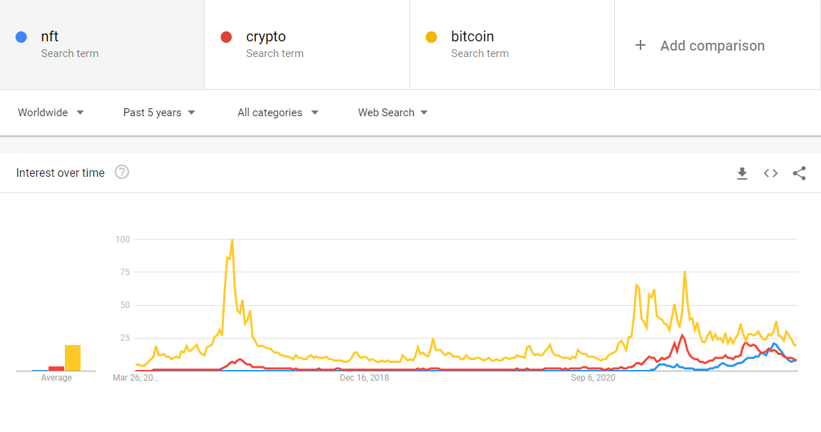 Throughout January 2021, 'NFT' interest surpassed 'crypto' and ran close to that of 'bitcoin'