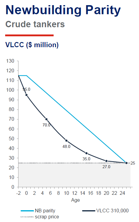 But here is the Clarkson and general broker view on large tankers, it doesn't make sense to me. There is no acknowledge that 0-6y ECO's should stay close to linear depreciation. Quite the opposite. And note that this is not due to new vessels not being able to get profit charters