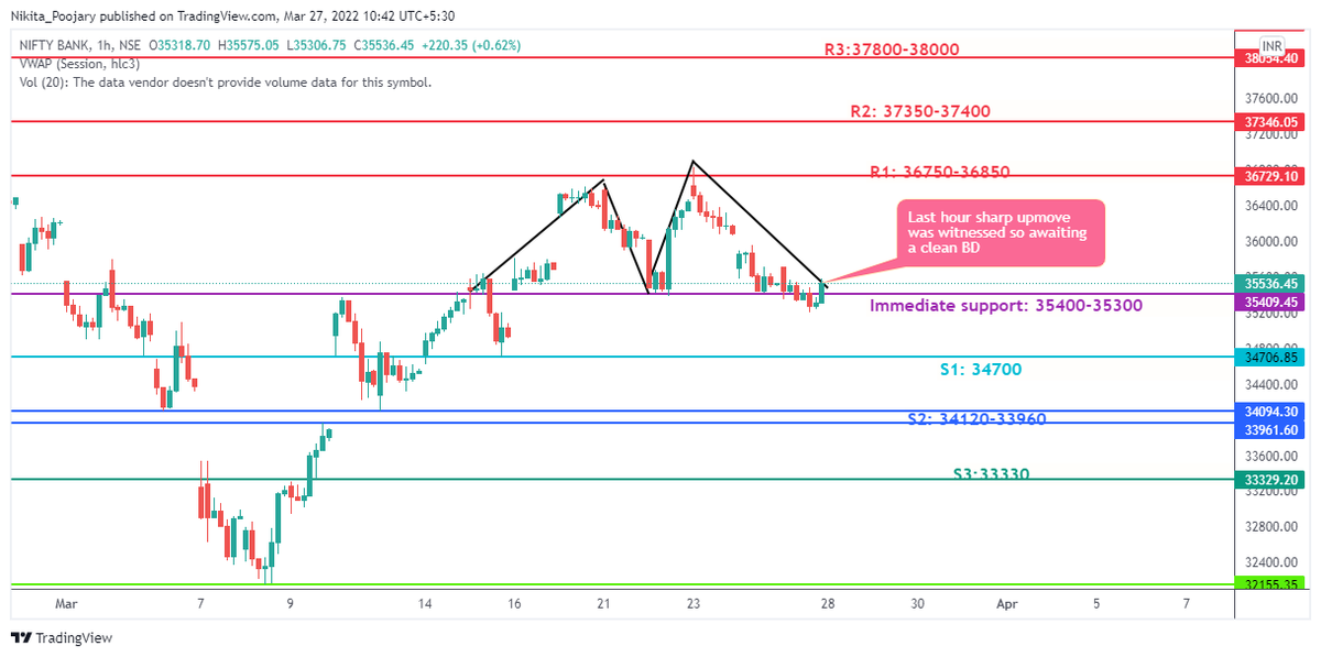 • Confirmation of the same would be if it starts trading <35400