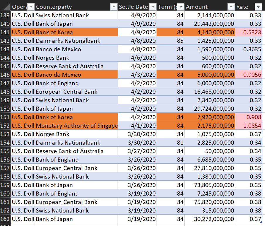 Mexico, Korea, and Singapore got really screwed on their 12-week swap interest rates early in the pandemic. (1.08% vs 0.3%). Mexico's own policy rate at this time was pretty high, but the others were basically zero. Later they all got the same rates. 3/
