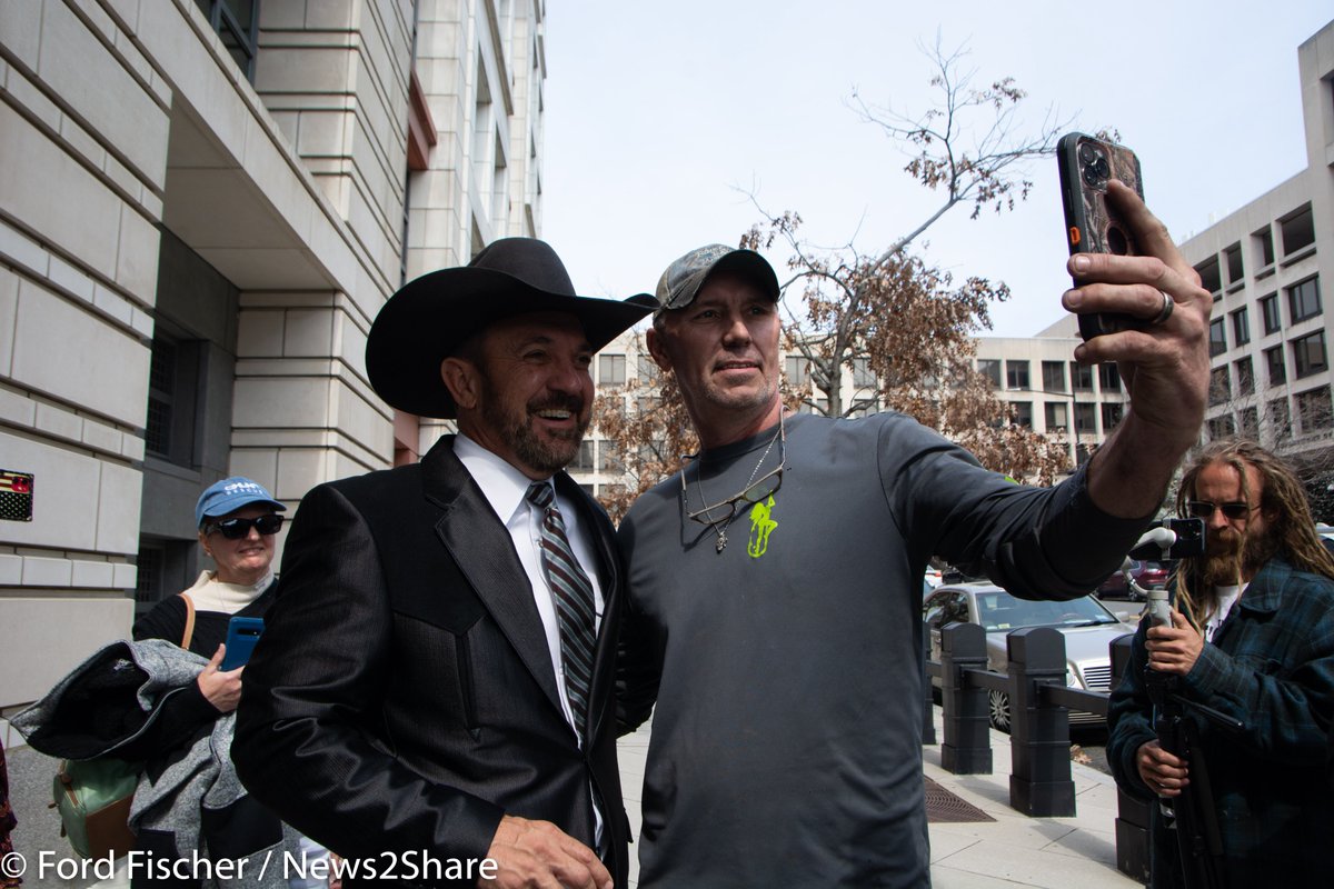 PHOTOS: @CowboyCouy Griffin speaks to press and poses for photos after being convicted on one count and acquitted on another for January 6 this afternoon.
