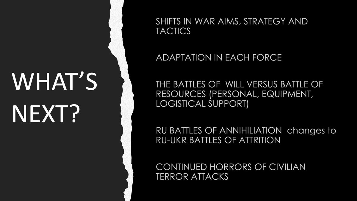 The two areas that will see the most attention are the shift in RU war aims/strategy, and the adaptation of each force to what they may face next.