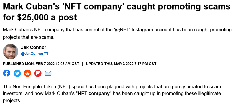1/ Later today @mcuban is one of the speakers on the NFTLA event and this is a reminder that 'his' @NFT page was responsible for many scams/rugs and many new people wanting to join the NFT space will likely have left the ecosystem because of this.