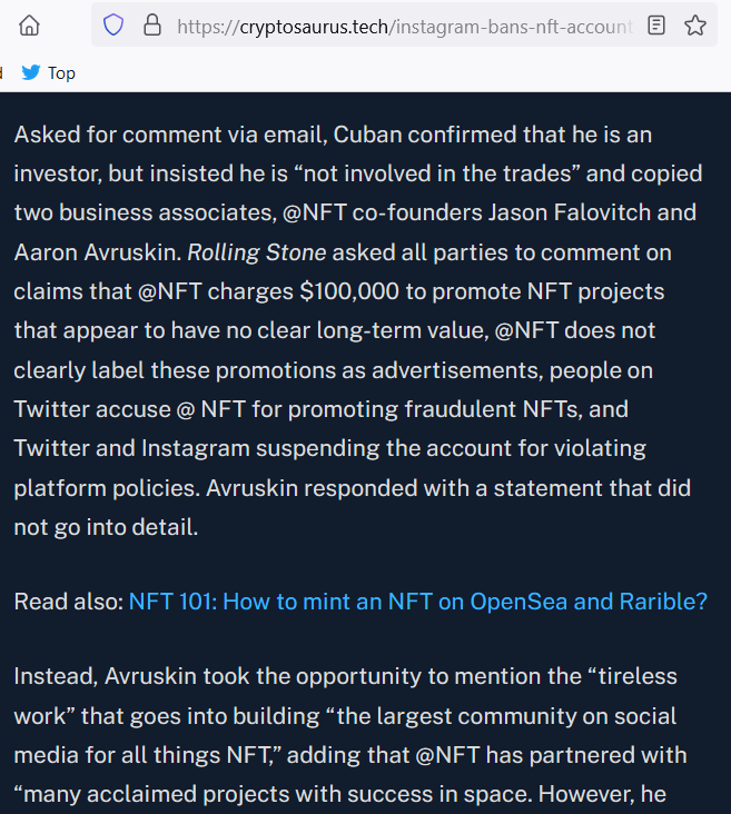 20/ And he mentions that people especially trusted @NFT because of Mark Cuban’s name on the page and the blue verified account. They tried to remove his name after this scandal came out, but the screenshots were already taken.