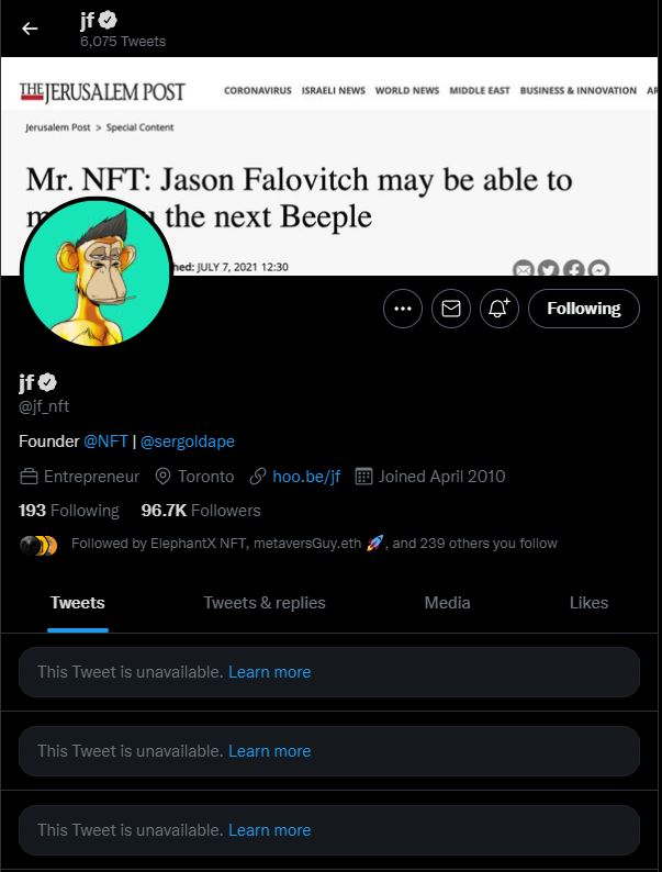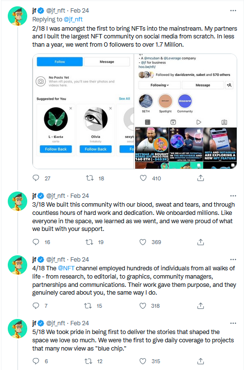 3/ Jason Falovitch (@jf_nft) together with Aaron Avruskin (@0xAA_NFT) were the co-founders of @NFT and @Leverage with Mark Cuban and Jason ("Mr. NFT" lol) posted a thread with his side of the story, 21 days after the original thread by @topshotfund:
