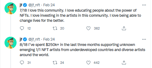 24/ Also remember that if you ever see a tweet from @jf_nft in which he asks which NFT to buy, he is likely buying it with your money that he gained via all kinds of dodgy scams. This whole space is filled with charlatans, and many are high profile names that operate in networks.
