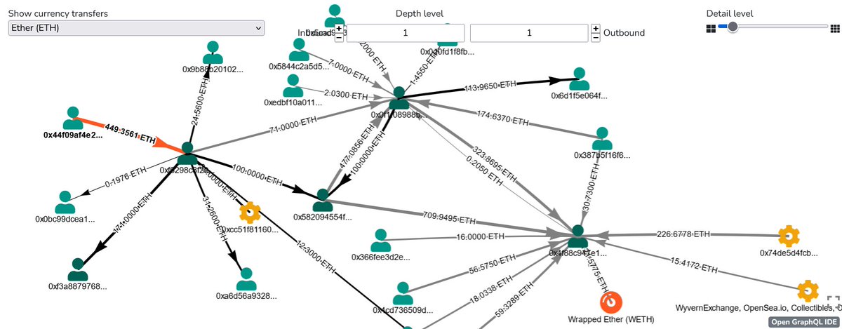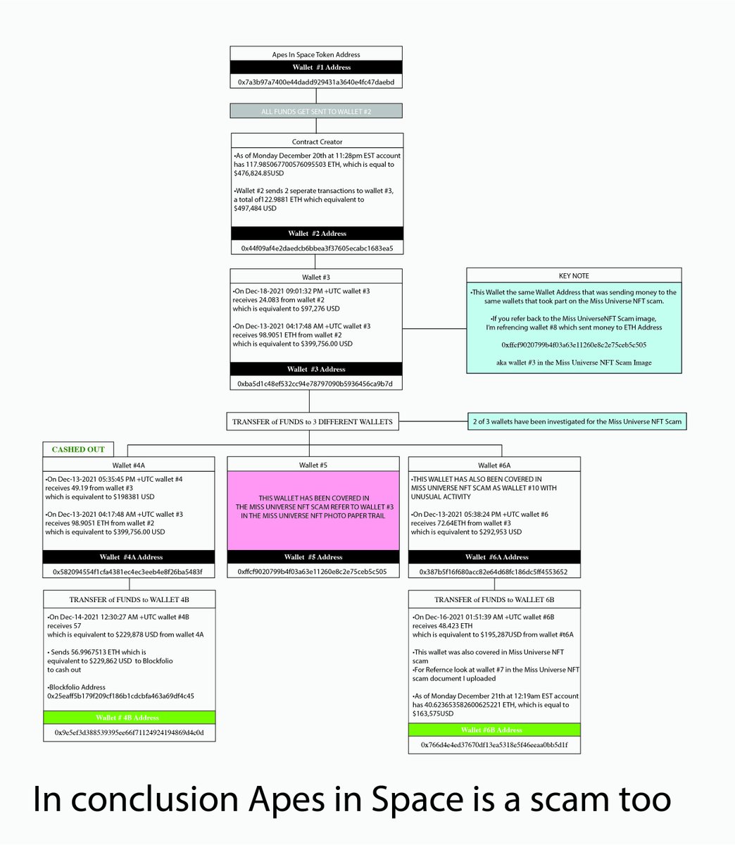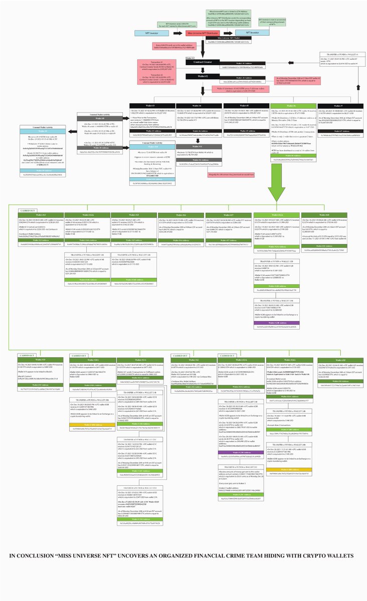 11/ The wallet connections with Apes in Space, which also has connections with the Miss Universe NFT. We noticed that 449 ETH was sent from the Space Apes wallet to another wallet that is associated with @NFT, and via that wallet sent 145 ETH is sent to Aaron and more to Jason.