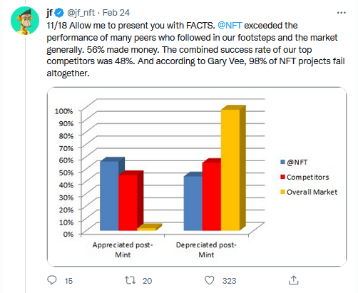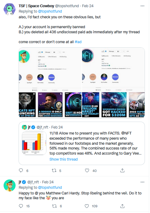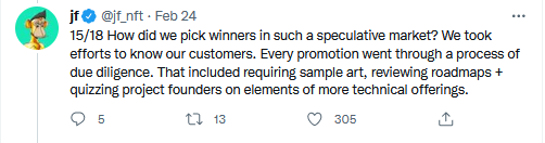 14/ If @jf_nft wants to provide us with facts, he should release the whole list of all projects that @NFT promoted and the money that they generated on each project. If they did their DD so well, they should also provide the info of the founders of projects that were rugs/scams.