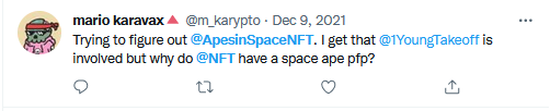 10/ Let’s look at @ApesinSpaceNFT, a project by @1YoungTakeoff (who purchased a CryptoPunk with the profit that he made), what was shilled so much by @NFT that they even changed their profile picture into a Space Ape.