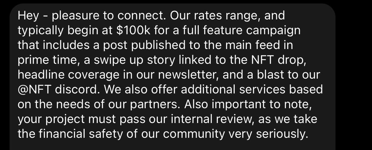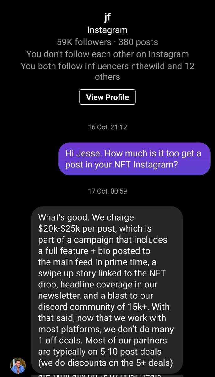15/ Just so that people know, @NFT asked $20000-$25000 per IG post and the minimum amount was 5 posts, to they would rake in anyway $100k- $125k per project! They also suggested that more posts is relatively cheaper, so ideal for scammers with multiple projects.