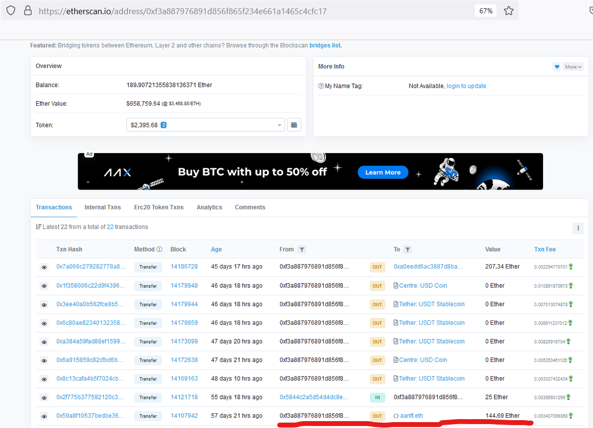 We noticed that 449 ETH was sent from the Apes in Space wallet to another wallet that is associated with @NFT and via that wallet 145 ETH was sent to Aaron Avruskin and even more to Jason Falovitch via different other wallets.