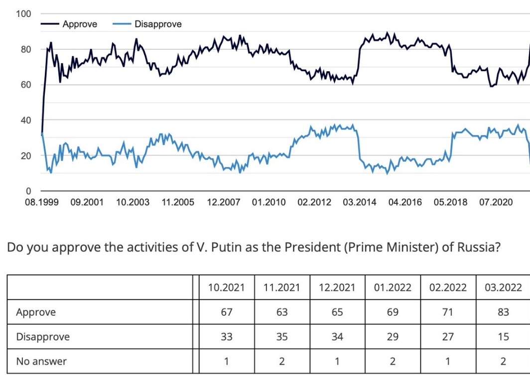 Incompatible with @Joebiden's wishful thinking, Levada-Centre publishes the results of opinion polls in Russia, showing that 83% of Russians approve of Putin's activities as president. levada.ru/en/ratings/