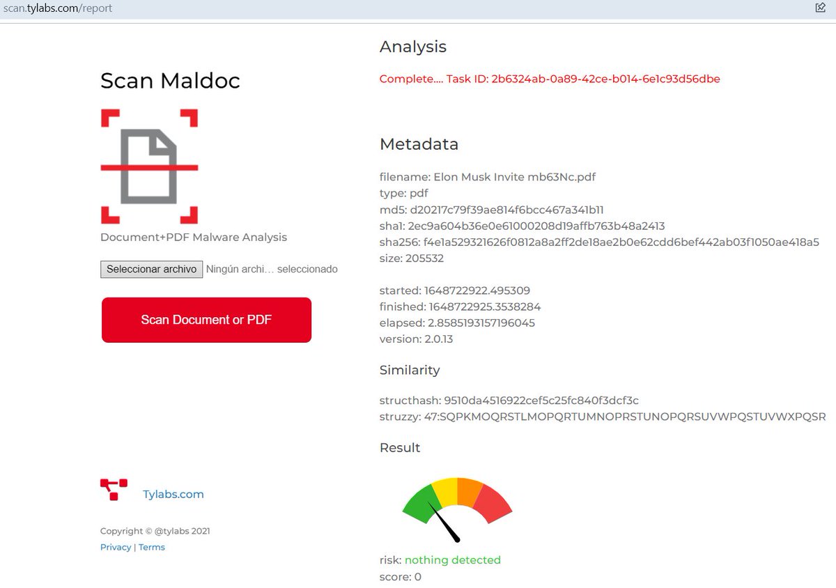 Otra herramienta, SCAN Maldoc. scan.tylabs.com/report?uuid=2b…"d20217c79f39ae814f6bcc467a341b11"