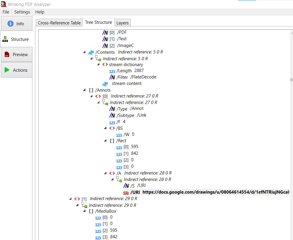 Podemos optar por otras herramientas de escritorio. Como Winking PDF Analyzer, que nos permite explorar toda la estructura del PDF y ver todos los objetos incrustados, e incluso ver si hay llamadas a URLs externas.