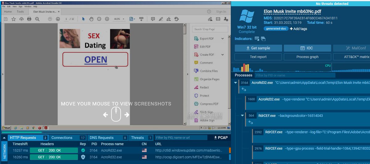 Remataré esto simulando la apertura del documento en una máquina virtual online y veremos que nos reporta el sistema. Para ello podemos usar any.run app.any.run/tasks/60a70365…