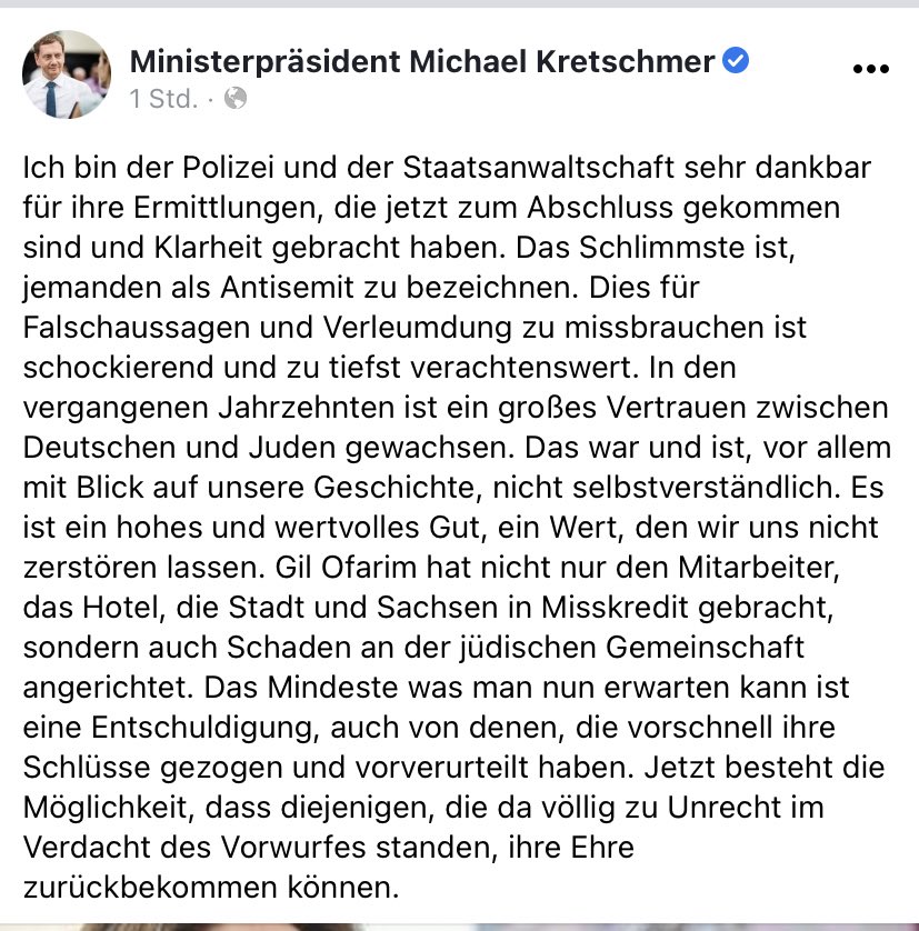 Hier Meiers ursprüngliche Äußerung am Nachmittag des Tages, als Ofarims Geschichte durch die Schlagzeilen lief. „Eine Entschuldigung reicht da nicht aus“ klingt für mich nicht nur nach „Beitrag zu einer gesellschaftlichen Debatte zur Bekämpfung von Antisemitismus“.