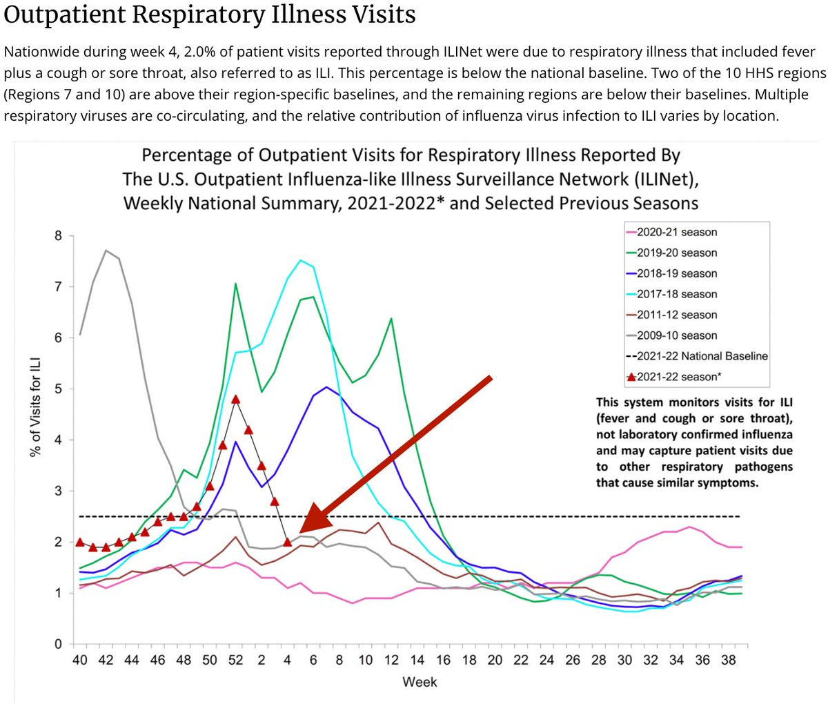 2. Currently influenza-like activity is "below baseline." That could mean we've passed the peak of flu season for winter 2021-22. That said, #flu B activity often occurs late in the season β sometimes into March & April. So there could be more flu later.