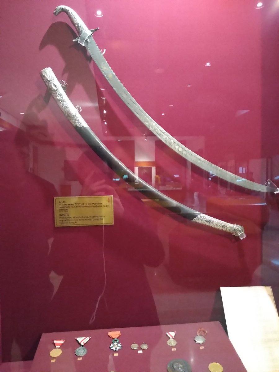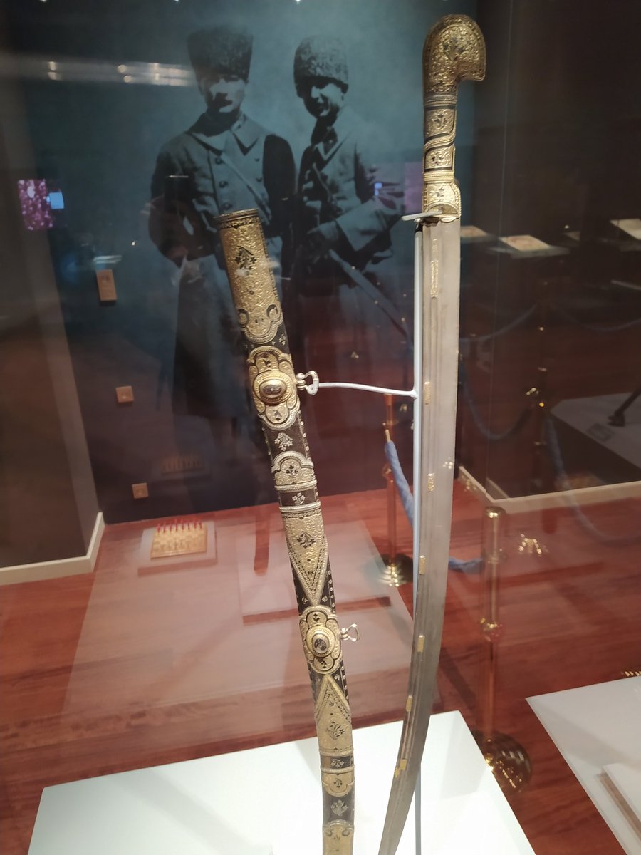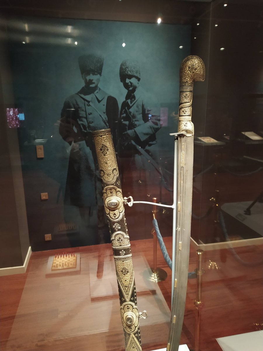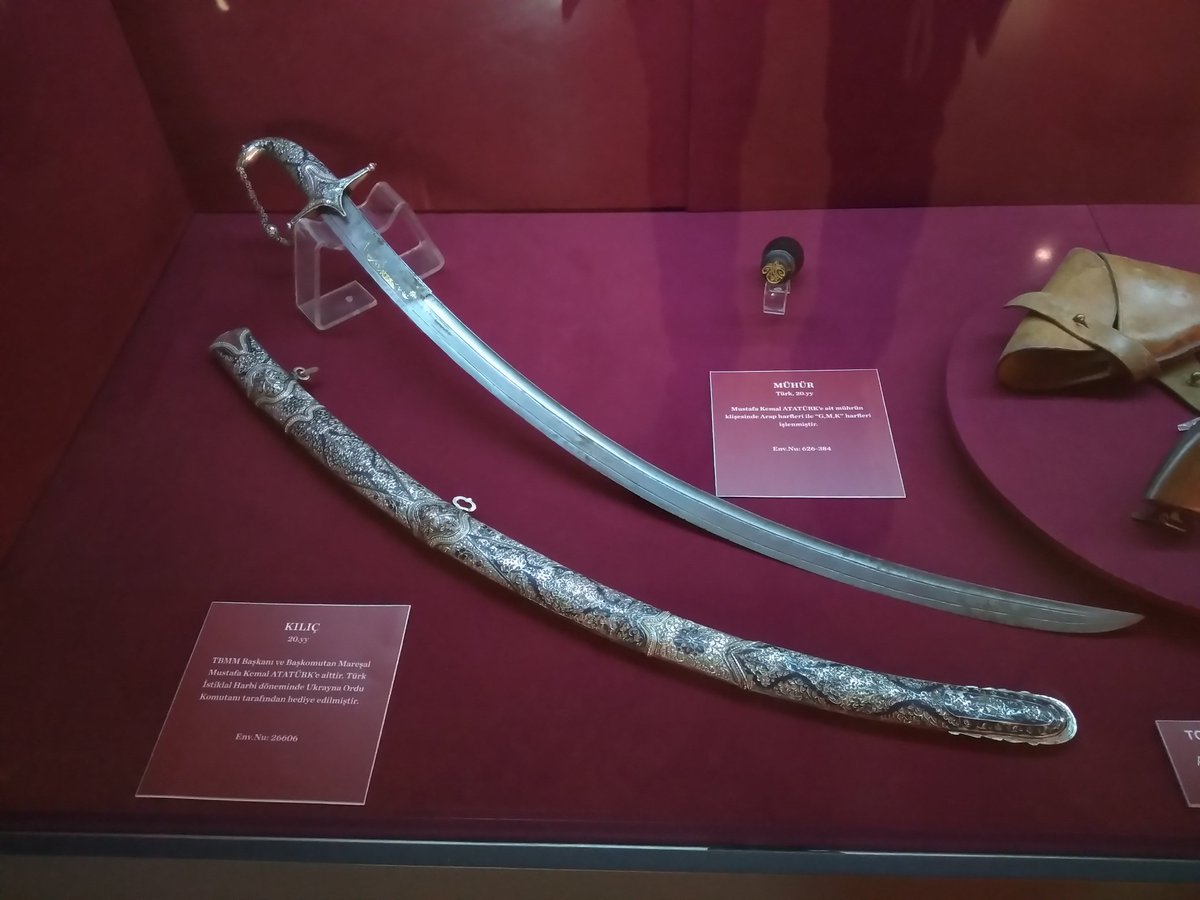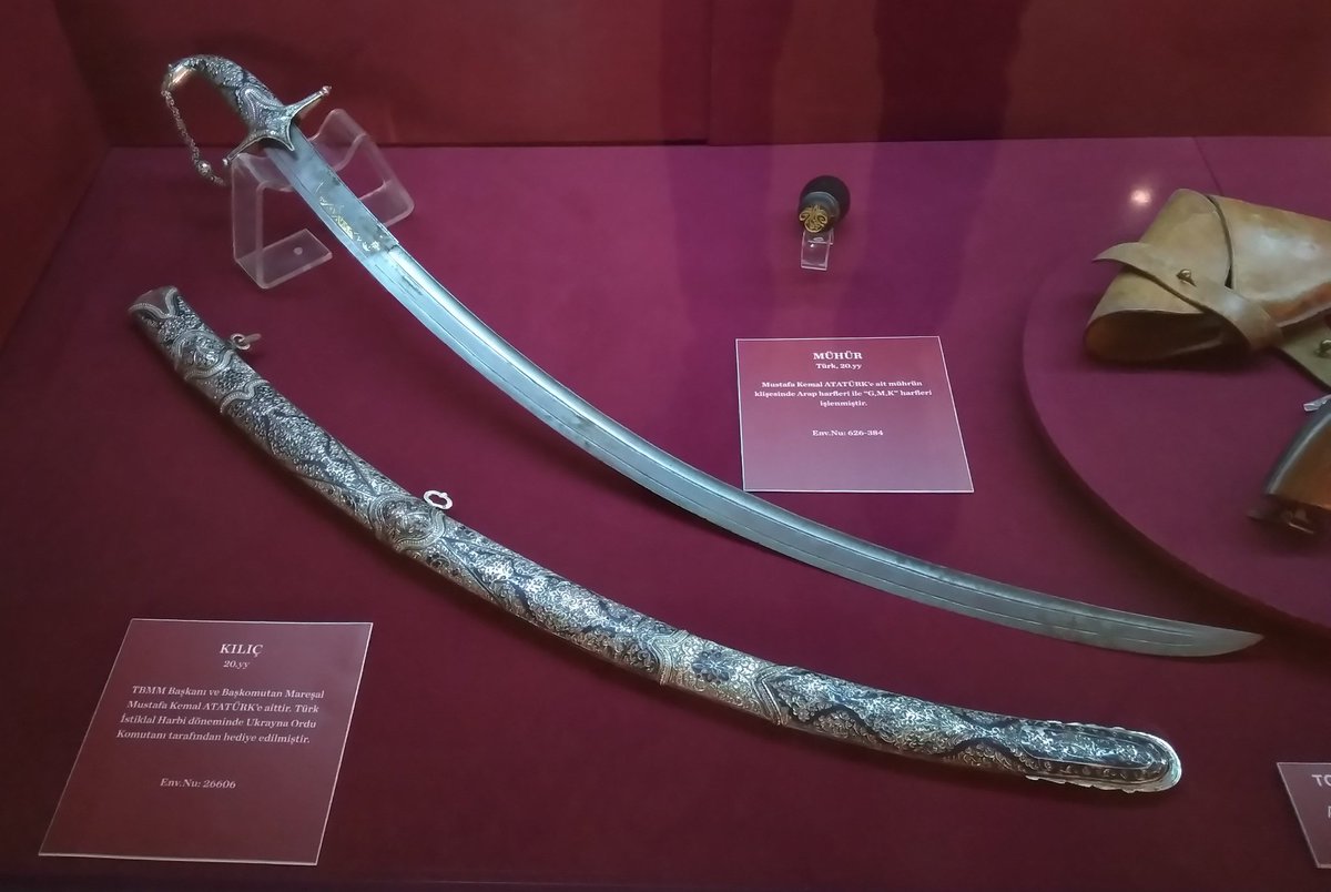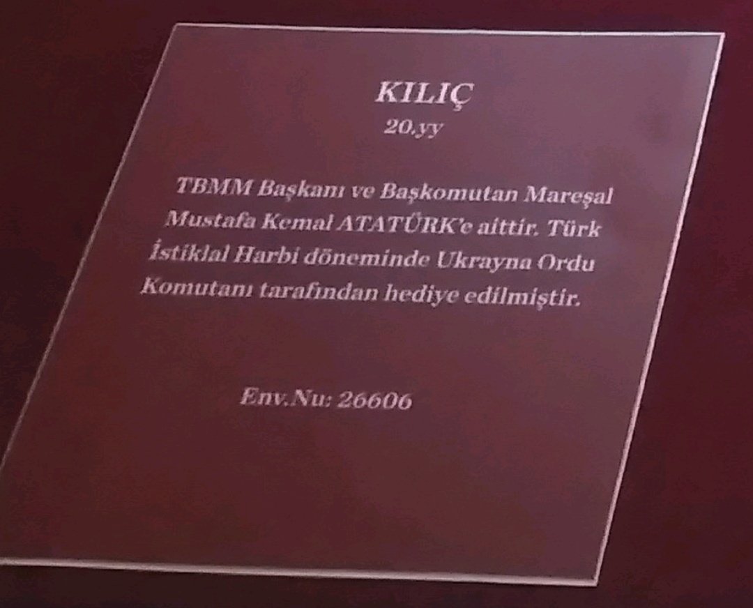 2019'da Harbiye Askeri Müzesi'ni ziyaret ederken Atatürk'e ait iki kılıç dikkatimi çekmişti. Bunlardan birinin Ukrayna Ordu Komutanı, diğerinin de Türkmenistan Beyleri tarafından armağan edildiği bilgisi yer alıyor.