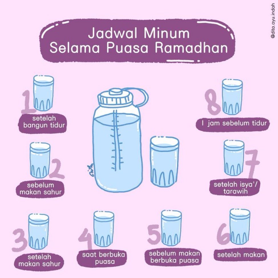 TIPS minum agar puasanya ga gampang haus 1. Jgn minum minuman berdiuretik seperti teh/kopi pas sahur 2. Tdk perlu minum terlalu bnyk pas sahur. Percuma, pasti beser 3. Pilih makanan berkuah & akhiri makan buah2an berair pas sahur 4. Minum cukup dg ikut jadwal di bawah