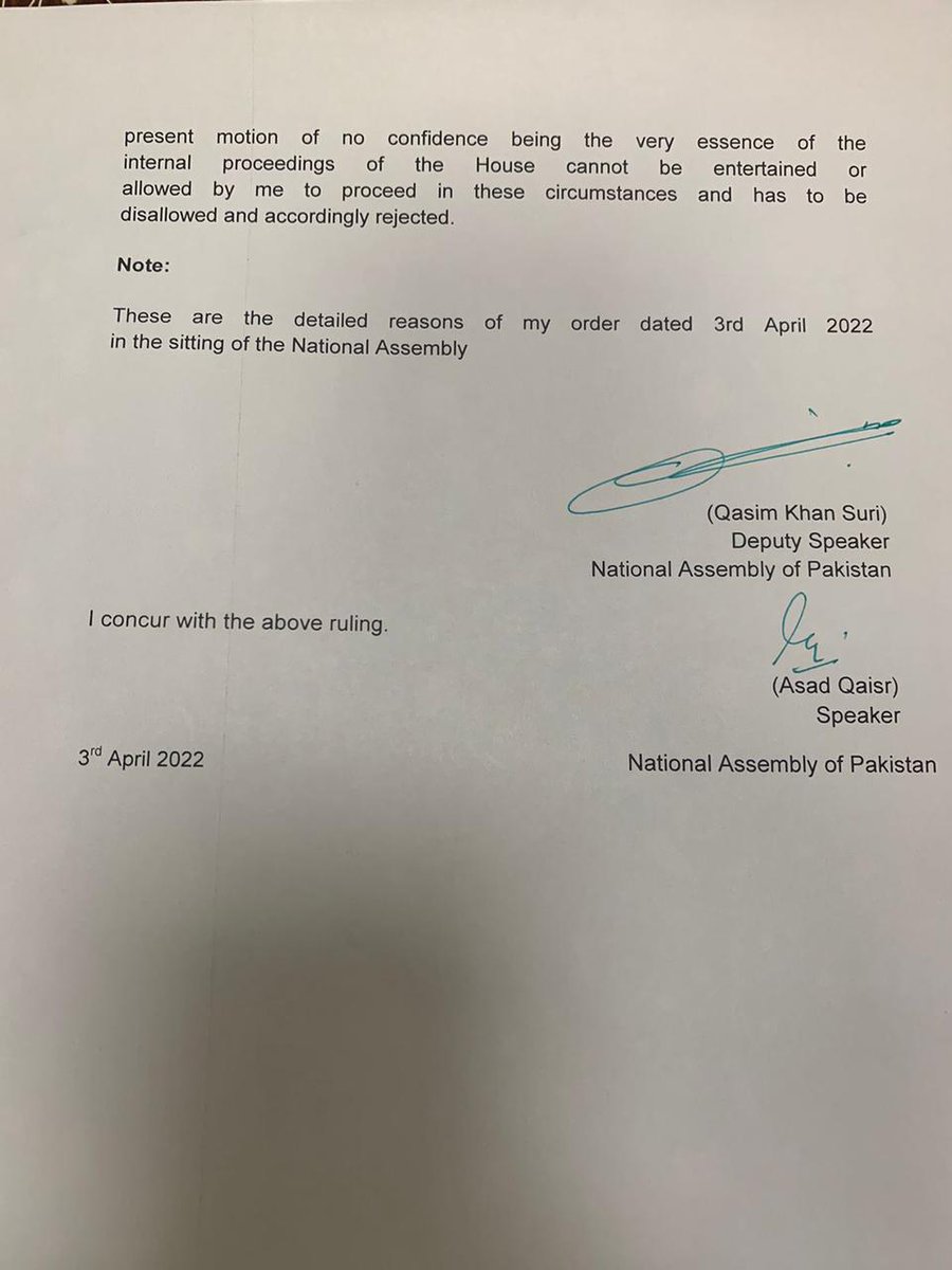 So the PTI govt. tried a two-step counter: to get over the vote of no-confidence bar in Article 58, the Speaker would first knock it out of the assembly, and the PM would dissolve the House right after. The Speaker framed his rejection of the motion as 'internal proceedings.'