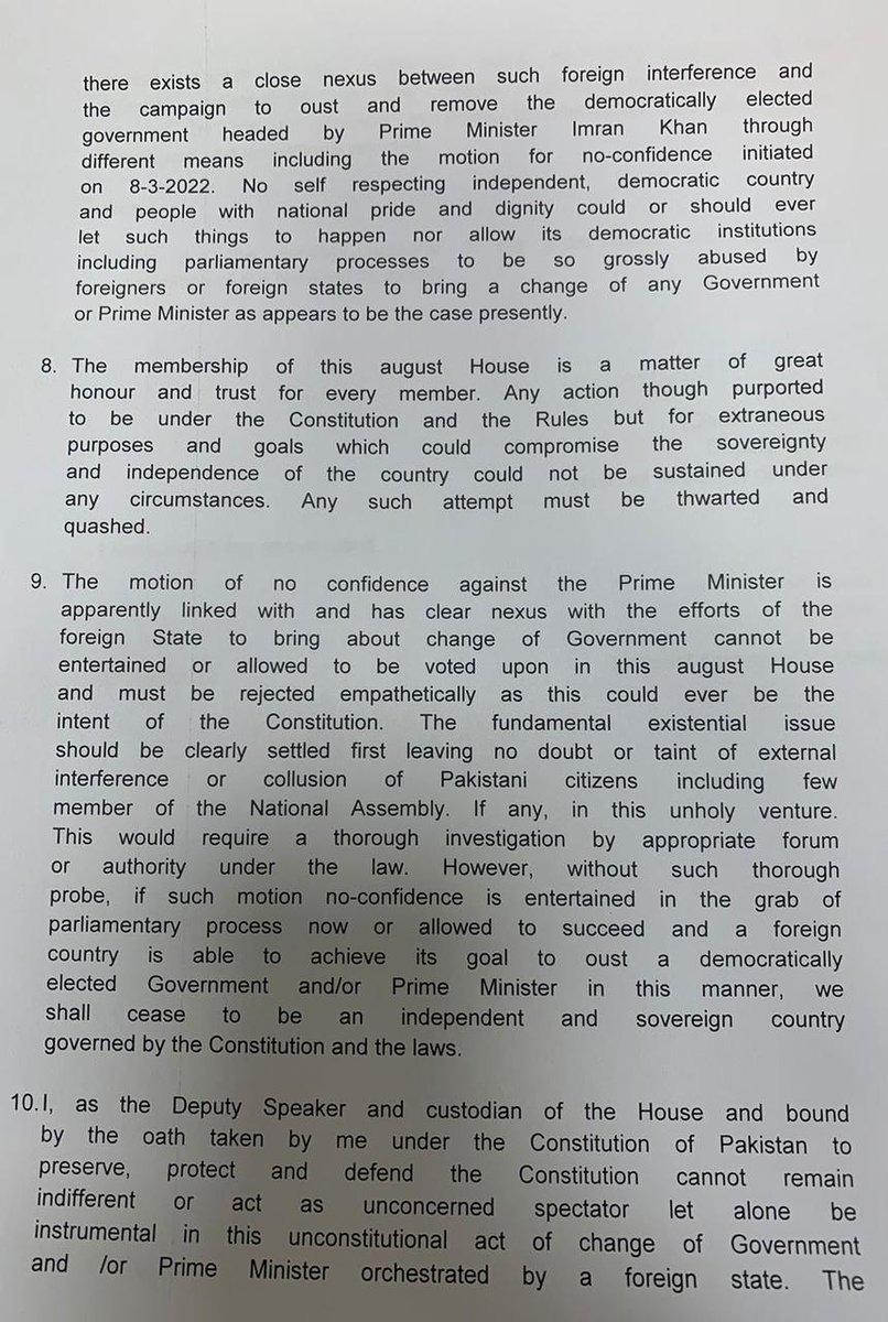 Soon after, the PM spoke of a foreign conspiracy. Per the Speaker’s eventual ruling, Islamabad received a cable on 7 March from Pakistan’s ambassador, who'd met a foreign official.