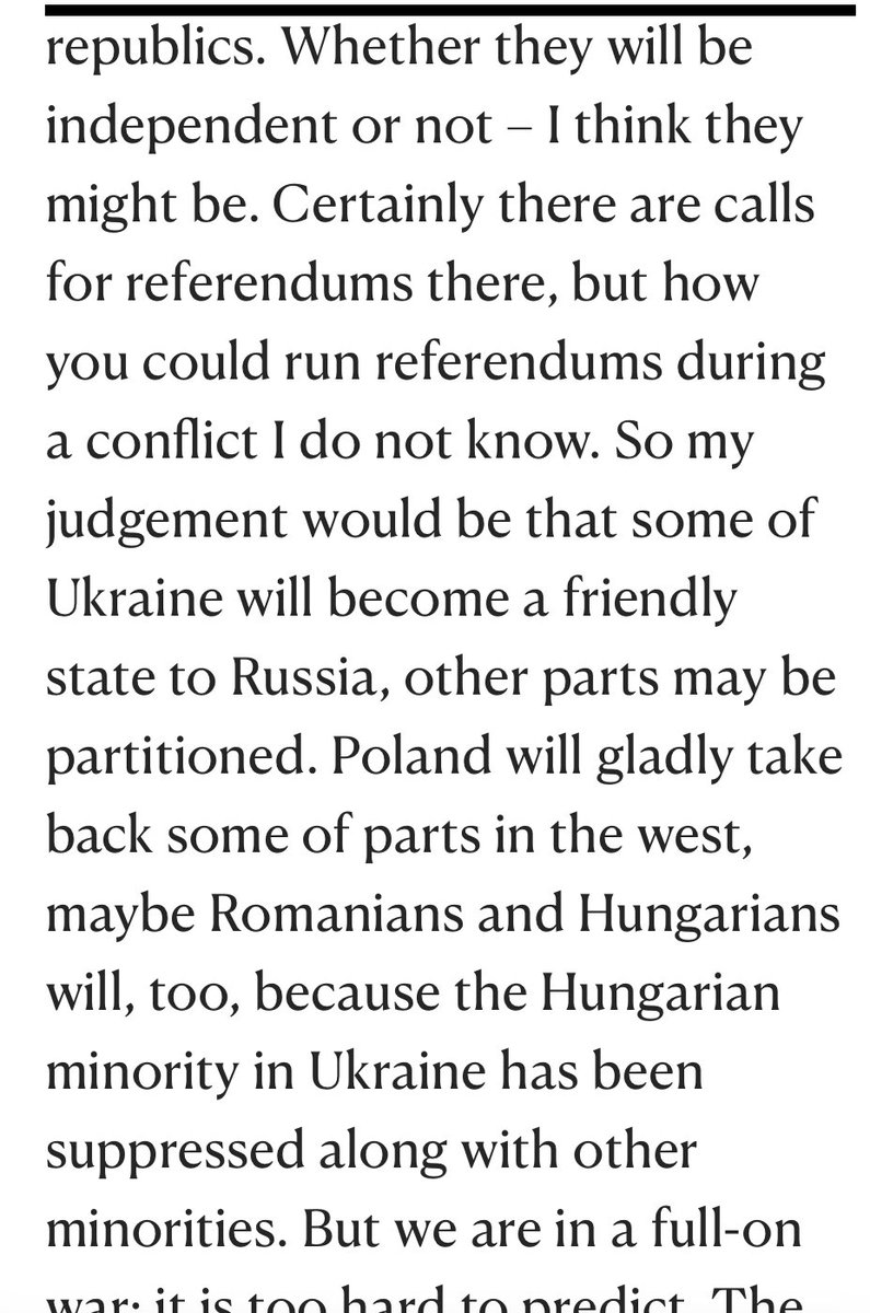 5) He mentions Poland twice: first by saying that Poland is always willing to fight, so probably it’s the only NATO country eager to stick to art. 5, and second, suggesting that Poland will likely join Russia in partitioning Ukraine. First is illusion, second is arrogance.