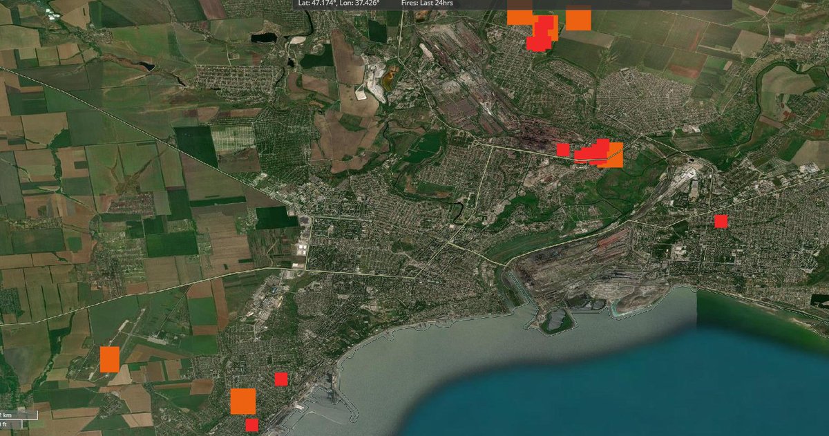 #Mariupol has fallen. There remain pockets of resistance. Thermal satellite data tells the story. Fading dots are days old hot spots, bright ones are from the last 24 hours. As we had expected, the fighting moved to the that hotel area in southern edge of the west bank. The last