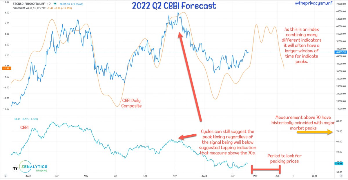 Here's the final thread for twitter on the Q2 Forecast. Yesterday I released the #BTC cycle projection. Today will be the projections for the total #crypto market cap, the CBBI, and the 10 Year Bonds. He was yesterday's tweet for a refresher.