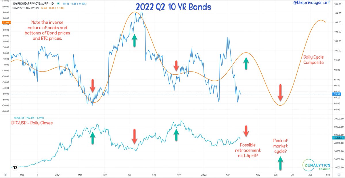 Projections on the #10YRBond prices that negatively correlate to #BTC show the potential of a retracement coming up in mid-April and the peak still coincides with a June timeframe.