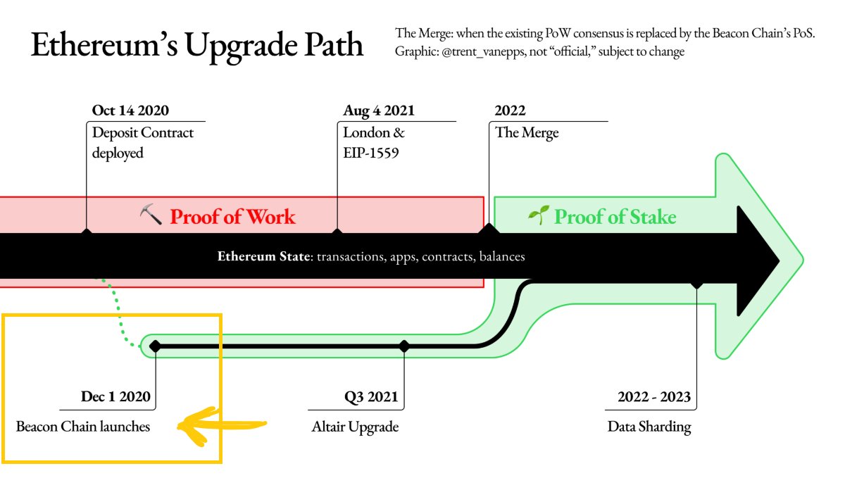 ➔ Beacon Chain is a PoS chain running separately w/ Ethereum. The chain is planned to merge w/ Ethereum