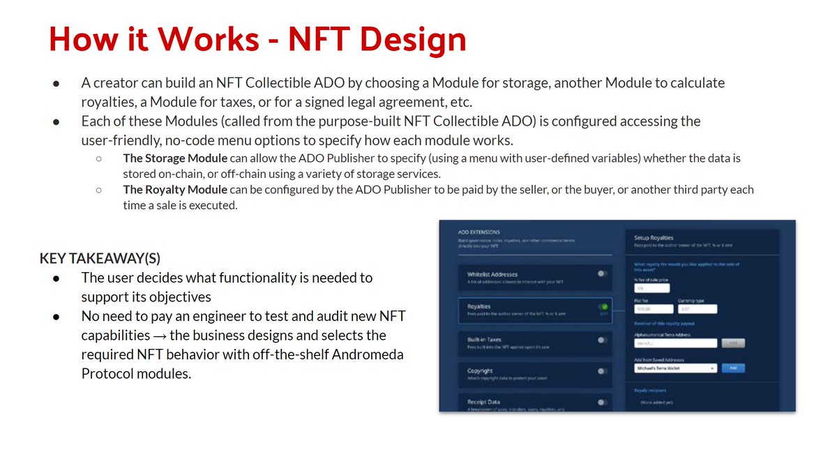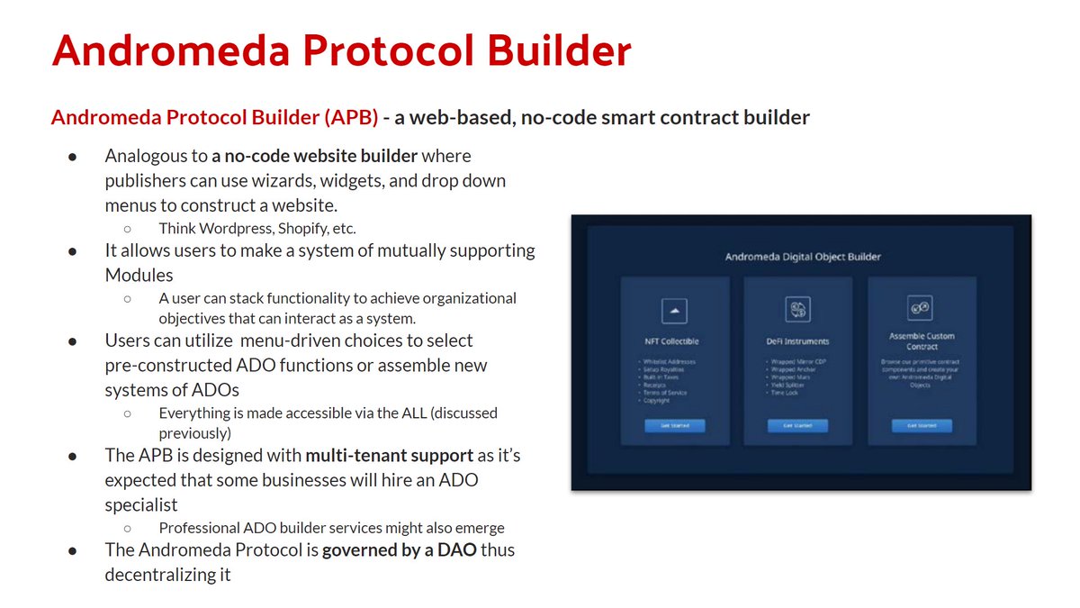 11 - The Andromeda Protocol Builder, a no-code required, user-facing interface, makes all of this accessible. Allowing users to make a system of mutually supporting modules, users can utilize menu-driven choices to select pre-constructed ADO functions or assemble new ADO systems