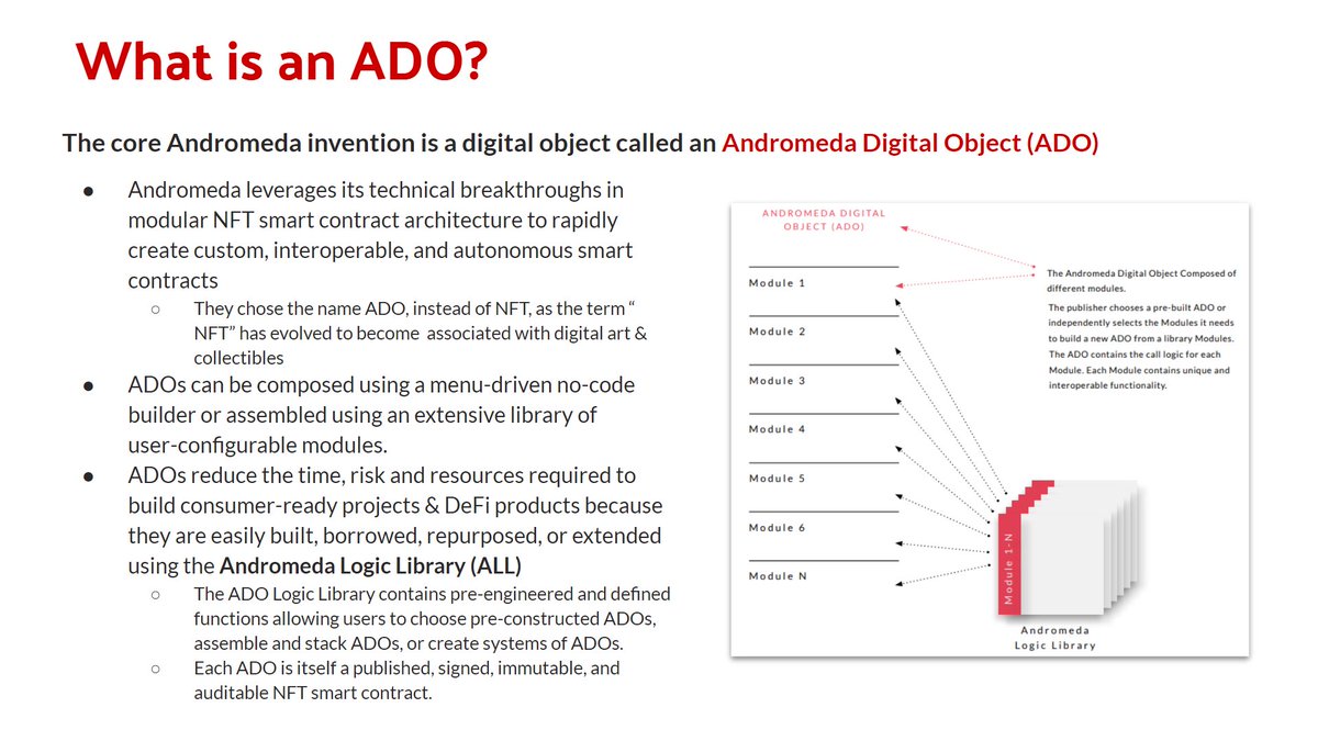 5 - Andromeda’s core innovation's called an Andromeda Digital Object. Utilizing modular NFT smart contract architecture, ADOs rapidly create custom interoperable, autonomous smart contracts. They can even be composed using a menu-driven no-code builder or assembled with the ALL