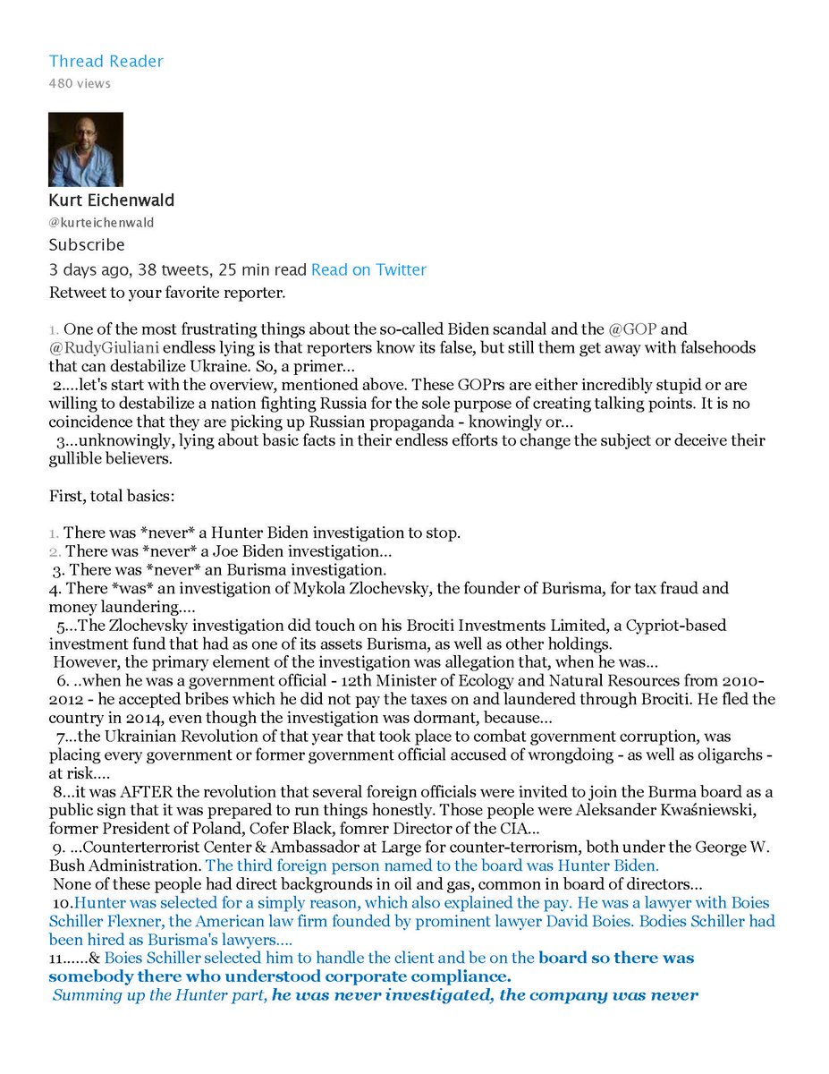 @JonLemire Here's a long thread on Hunter Biden/Ukraine/Burisma narrative by @kurteichenwald I saved. These stories never die. Yale Law grad Hunter has experience in corporate compliance (Think Sarbanes Oxley) needed to set up anti corruption guardrails 4 Bursima,skills HB had 1/