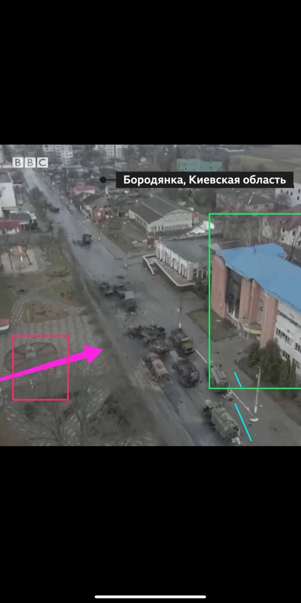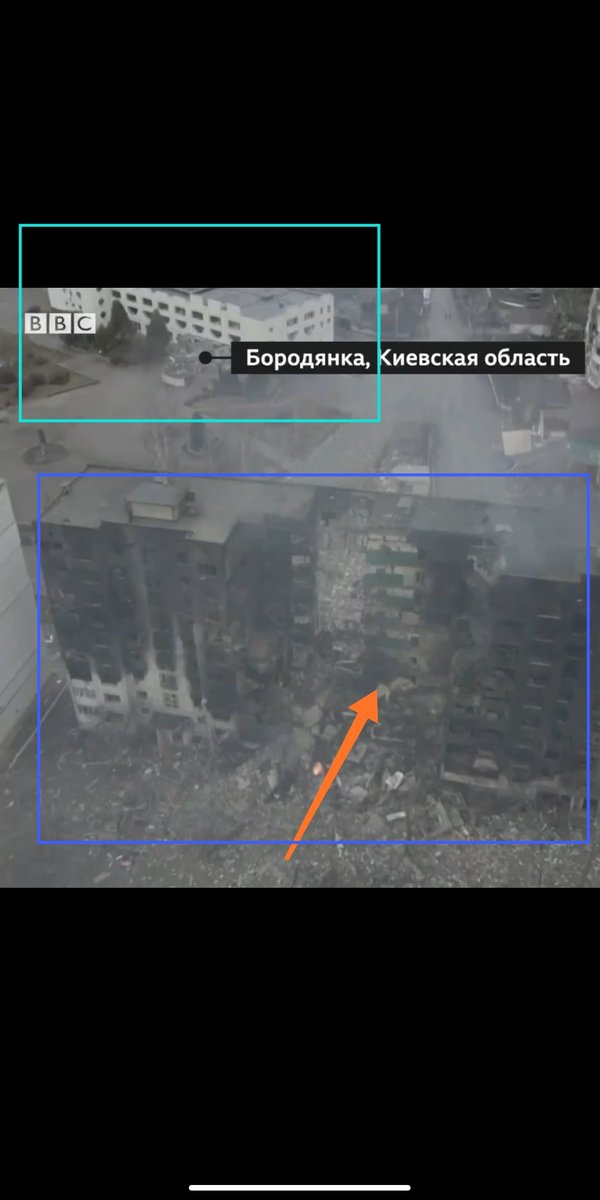 In reality buildings were destroyed by Ukrainian MRLS shelling came from North East in a direction of a Lenin street on which column was moving. Most rockets seem to have hit those 2 buildings.