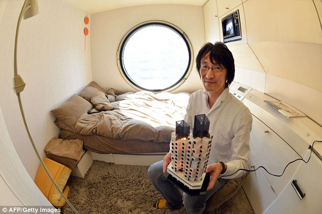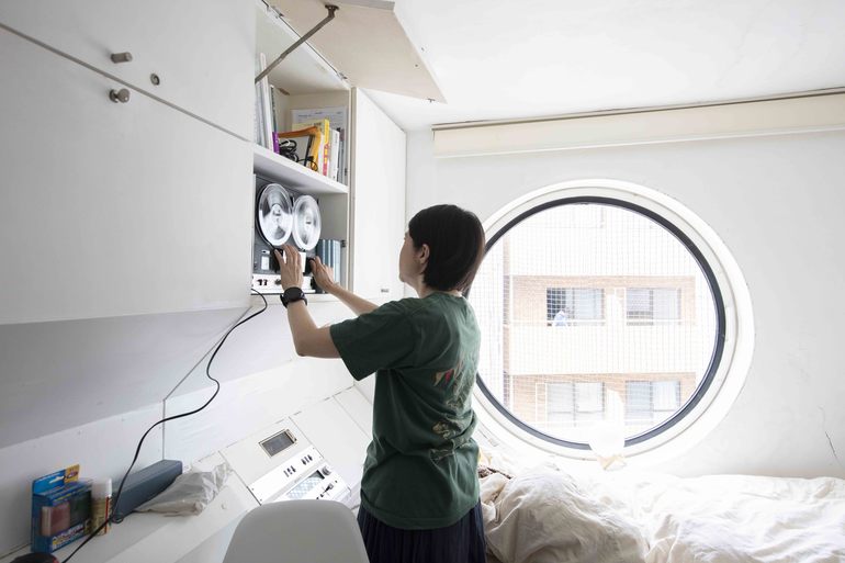 设计师黑川纪章在中银胶囊塔里,捧着中银胶囊塔模型