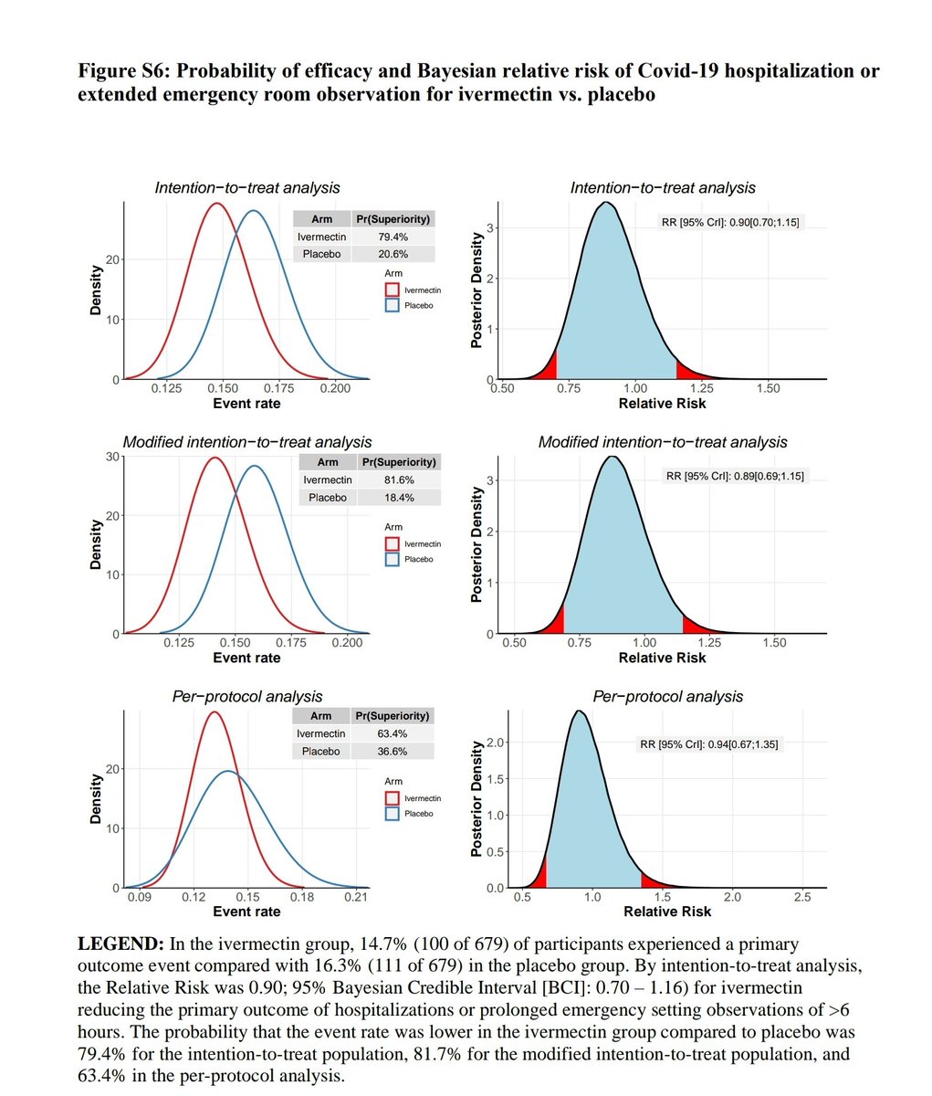 Why is the per-protocol placebo (blue) curve shifted left compared to ITT/mITT placebo groups? It appears the per-protocol analysis gives lower superiority probability not because ivm did worse, but because placebo did better.