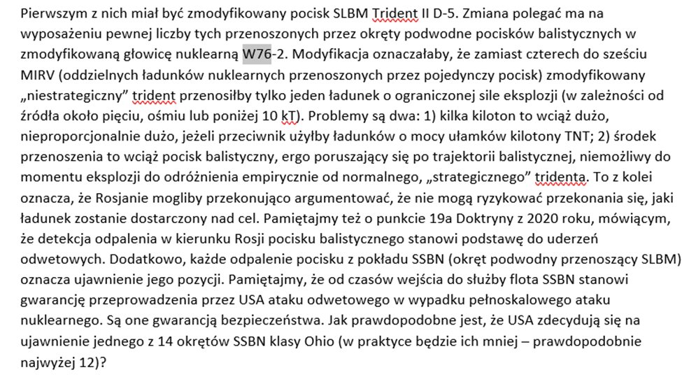 16/45 Decyzję o ich stworzeniu podjęła adm. Trumpa – specjalnie dlatego, aby zmniejszyć asymetrię zdolności w zakresie niestrategicznej broni nuklearnej vis a vis Rosji. Tym samym, w związku z decyzją Bidena i tak niekorzystny rachunek sił jeszcze się pogłębia.