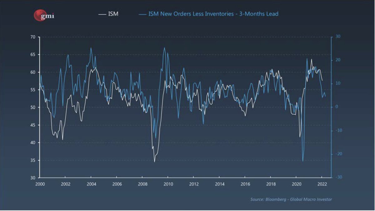 ISM New Orders Less Inventories is falling and prices ISM at 53 in 3 months (not yet recession but lower growth)