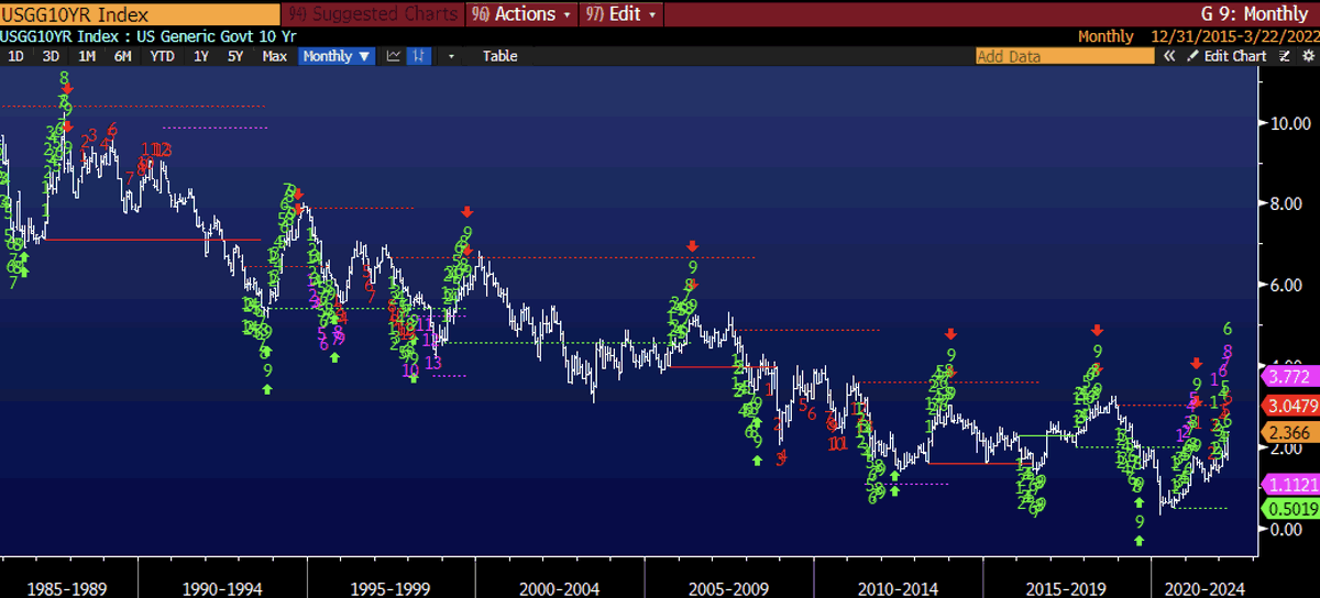 DeMark Monthly 9's have caught every cycle top and it suggests another 3 months at or above the regression channel (maybe as high as 2.5) BUT no cycle high has ever exceeded previous, so that is the Thing Have Changed line in the sand (around 3.25%).