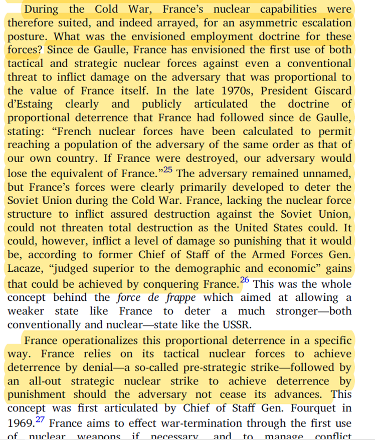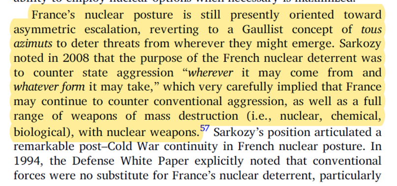 24/45 Fakt, że🇫🇷zadecydowała o utrzymaniu postawy „asymetrycznej eskalacji” pomimo upadku ZSRR (jedyny prawdopodobny przeciwnik konwencjonalny) jest ciekawy, ale na inną rozmowę. Sęk w tym, że zmianie nie uległa zasadniczo doktryna deklaratywna i strategia użycia broni nuklearnej