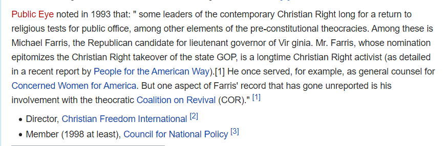 Michael Farris epitomizes Christian Right takeover of state GOP, is a longtime activist. Served as gen counsel Concerned Women for America. Farris' record has gone unreported of his involvement w/theocratic Coalition on Revival (COR)."
