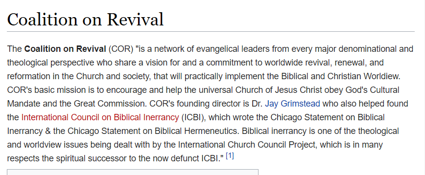 Coalition on Revival (COR) "network of evangelical leaders from every denominational & theological perspective who share a vision & commitment to world revival & reformation in Church & society, to practically implement the Biblical & Christian Worldview. sourcewatch.org/index.php/Coal…