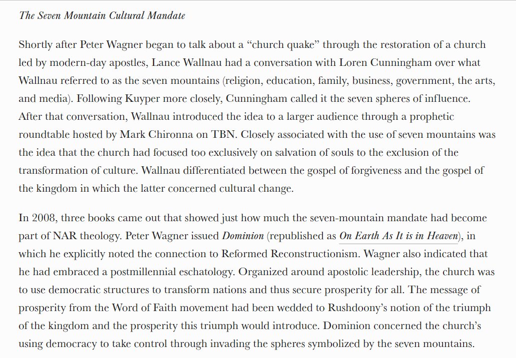 Three overlapping theological emphases represent the NAR’s doctrinal center: the church, spiritual warfare, and the cultural mandate.