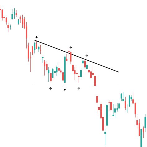 En español, el precio hace máximos decrecientes a medida que nos acercamos al soporte, lo que muestra un compromiso de los vendedores para llevarse puesta la demanda.