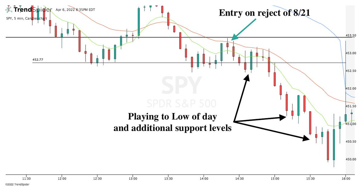 An A+ bearish setup using this strategy is when price is trading below the 8ema, which is under the 21ema, which is under vwap. I am waiting for a rejection of my 8ema and looking to see buying pressure (ideally in the form of an inverted hammer candle)