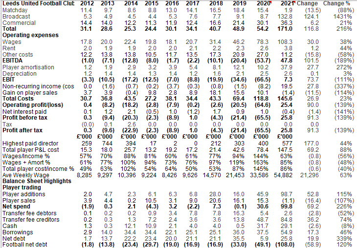 Leeds underlying profits (adjusting for one off non-recurring items) of £7m mean it was only one of two clubs to make a profit in 2020/21...both from Yorkshire