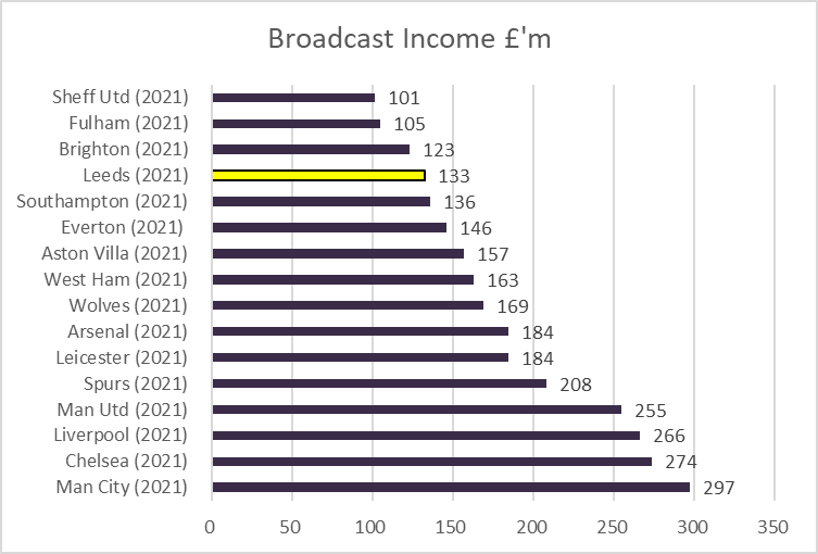 Leeds income almost tripled in 20/21 to £171m, broadcast income main driver, 77% of total. Would have been substantially higher had covid not hit Matchday income so hard