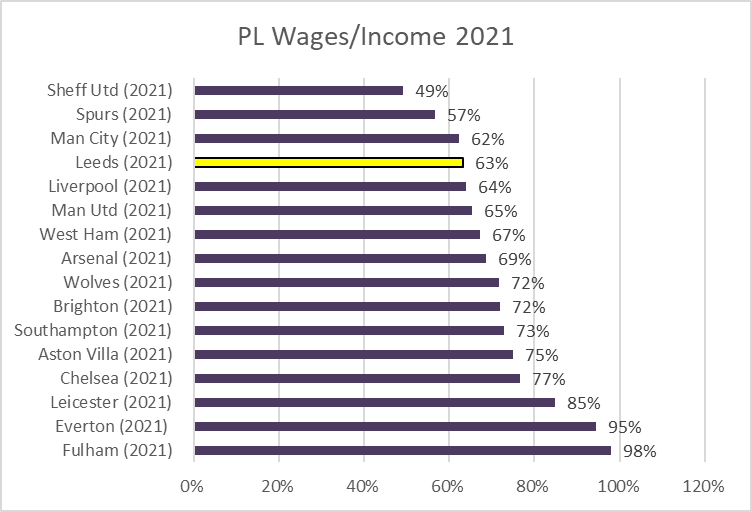 Leeds wage bill second lowest in PL but only covers 11 months, would have been £118m on annualised basis. Expect to rise again if avoid relegation due to new signings and contracts. Wages 63% of income well within UEFA guidelines.