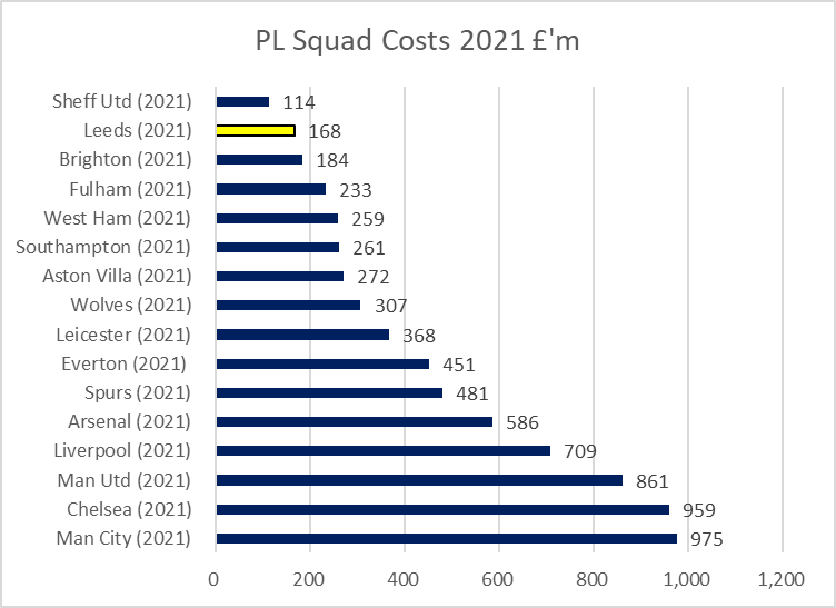 Leeds player signings significantly higher than most clubs historically in first season in PL. Squad cost was 2nd lowest in PL at end of season.